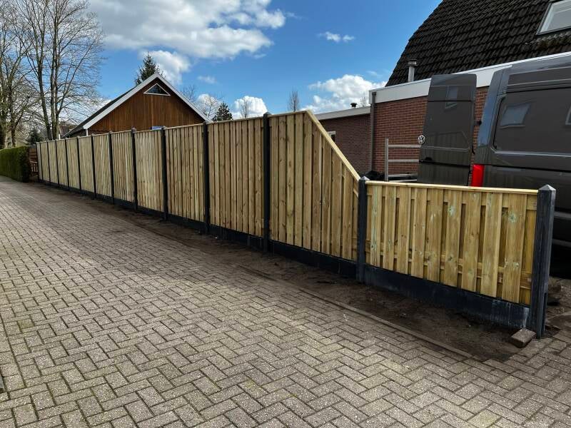 Standaard antraciet kleurige palen en onderplaten en geïmpregneerde schutting schermen.